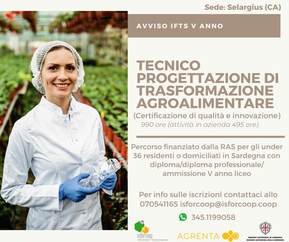 1. TECNICO PROGETTAZIONE DI TRASFORMAZIONE AGROALIMENTARE (GESTIONE, QUALITA' E INNOVAZIONE PRODUZIONE) - SEDE: SELARGIUS (SU PLANU) - codice per l'iscrizione: 2023RTS2271352